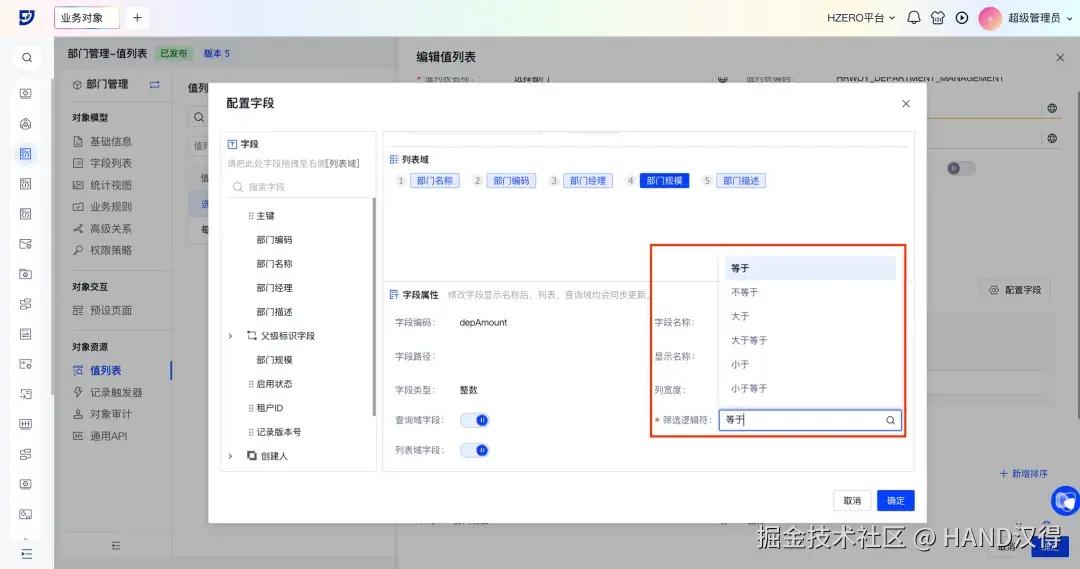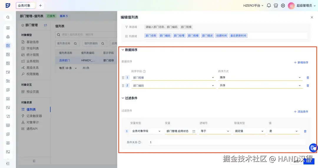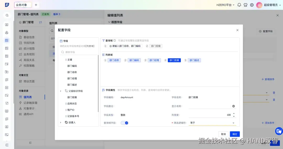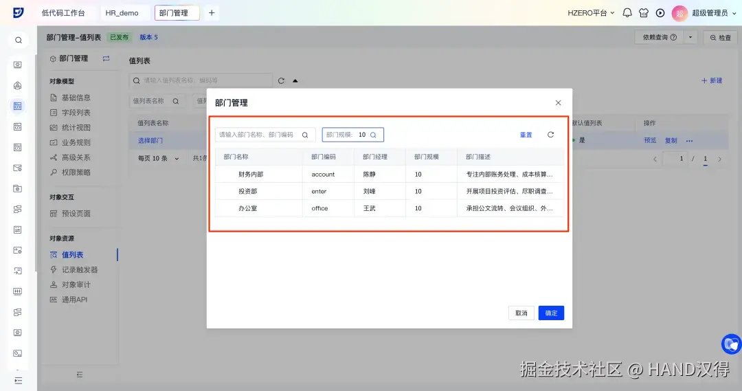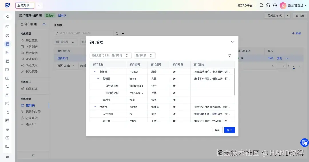 以HR管理-部门管理业务对象“选择部门”值列表为例,配置后可实现以下效果: