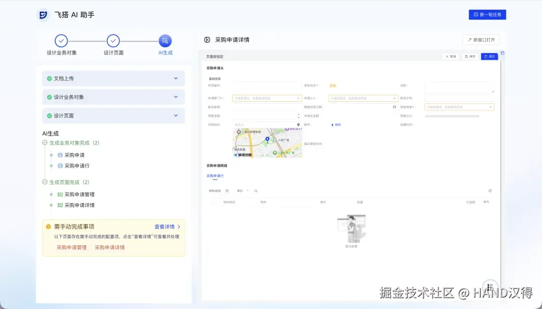 在传统开发里,这意味着: 控制器、接口、校验、状态处理…… 而在飞搭,你只需要描述: “点击提交后保存采购申请,并提示提交成功。”