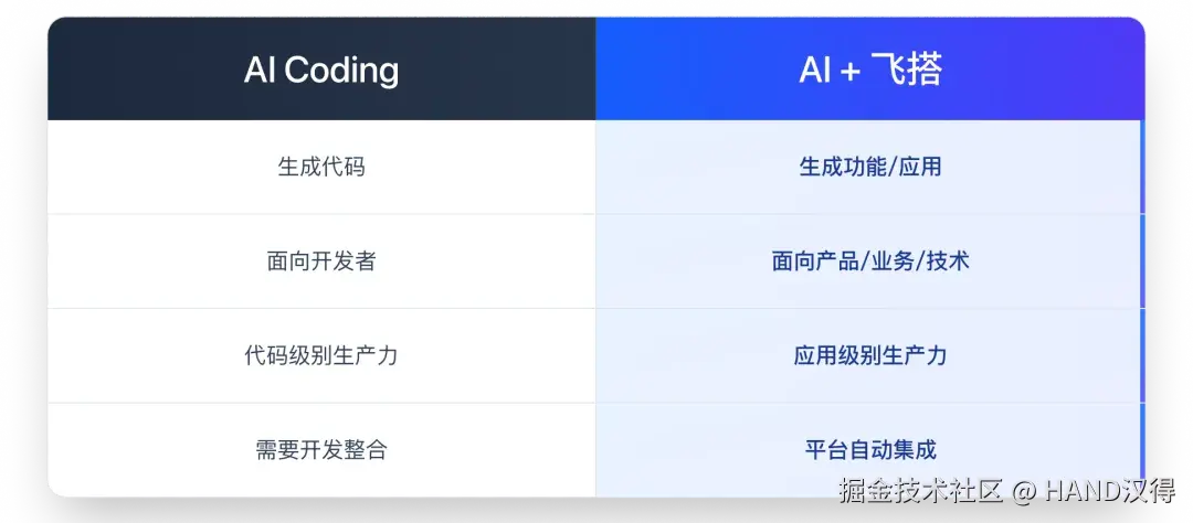简单说: AI Coding 是更快地写代码。 AI +飞搭是更快地做应用。