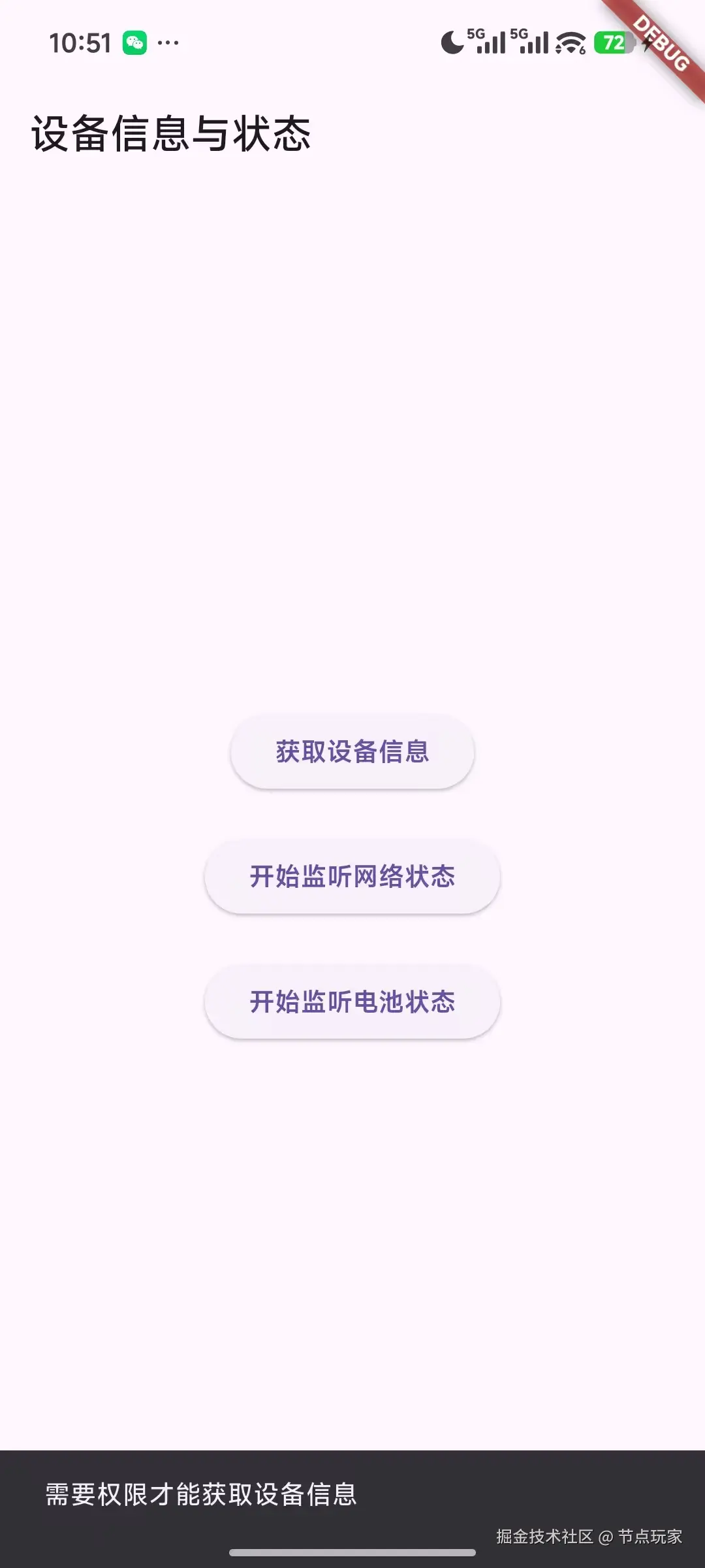 - Connectivity().onConnectivityChanged:监听网络状态变化(实时回调) | | 电池状态 | battery_plus | - Battery().batteryLevel:获取当前电池电量(0-100)