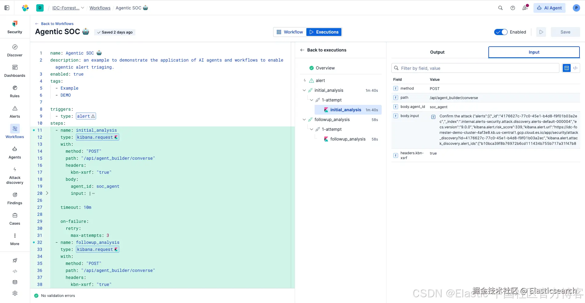 Workflows 通过与 Elastic Agent Builder 集成获得其 agentic 能力,Elastic Agent Builder 是 Elasticsearch 的原生功能,用于创建自定义 AI agents。该集成是双向的。Workflows 可调用 agents 作为智能步骤进行分析和决策。Agents 可调用 Workflows 作为工具执行具体操作,如隔离 host、查询 threat intel、升级 incident 或更新 case。每个操作和推理步骤都是透明且可配置的。