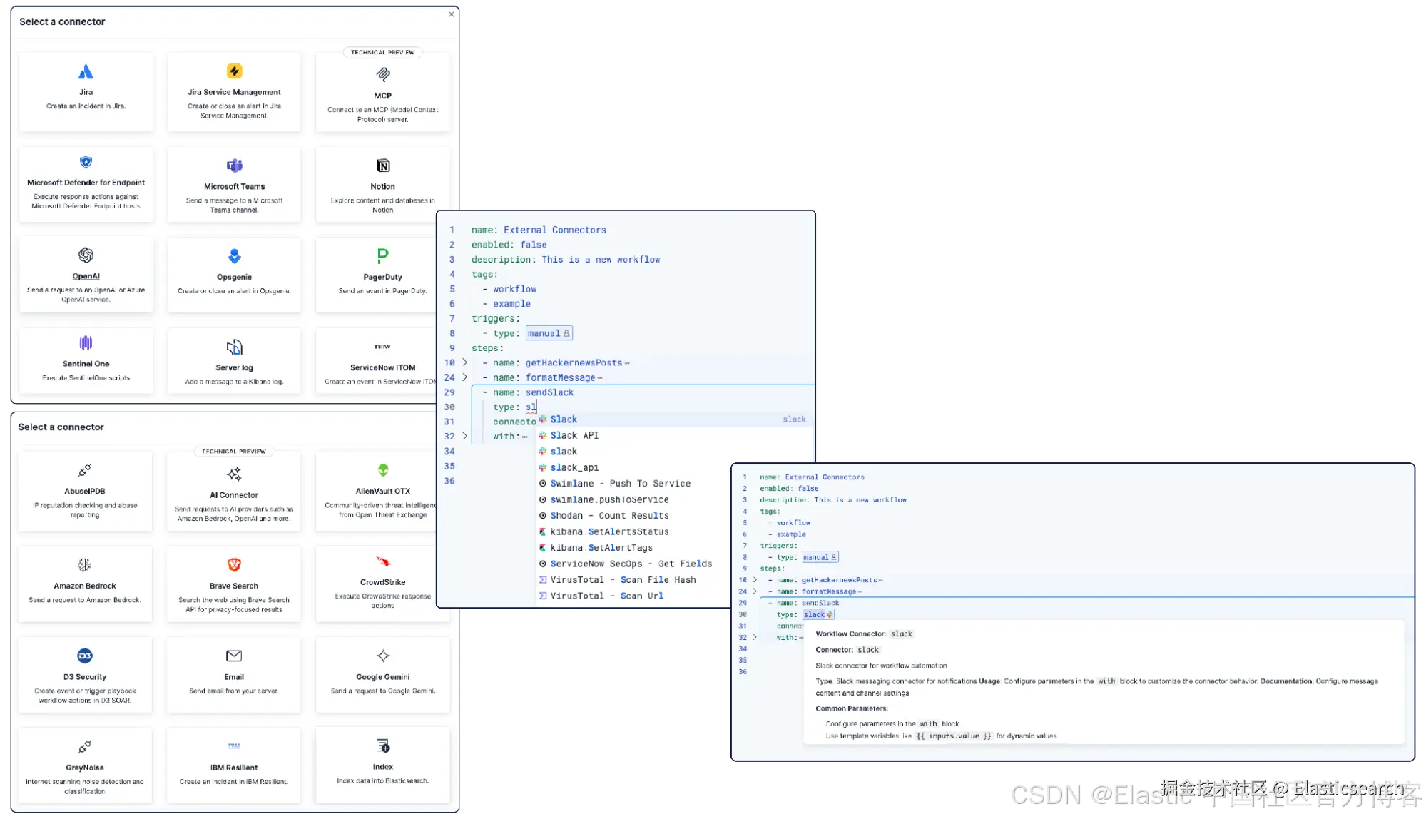 Elastic Workflows,目前处于技术预览阶段,将原生自动化引入 Elastic Security,这个 agentic 安全运营平台已包括统一 SIEM 和 XDR。停止支付自动化税。不需要购买、集成或维护单独的 SOAR(Security Orchestration, Automation, and Response)工具。