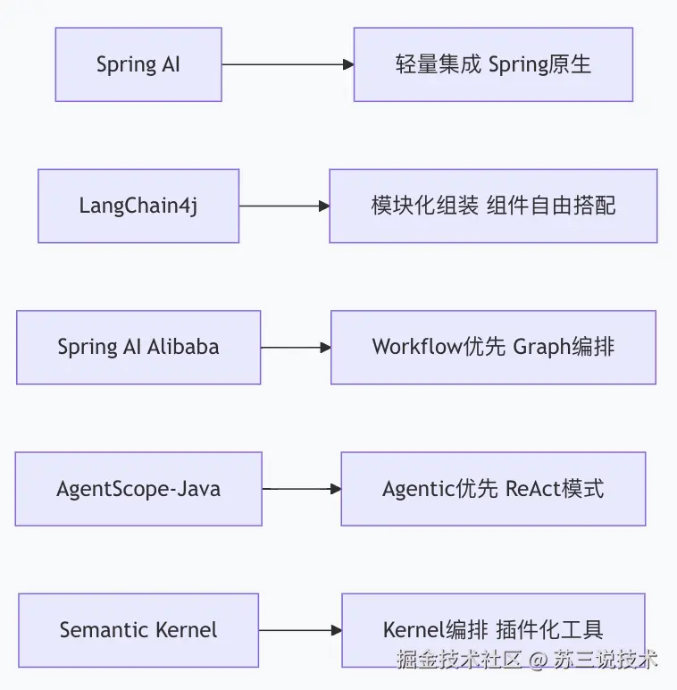 | Spring AI | Spring生态AI集成 | 轻量便捷 | 标准企业应用 |