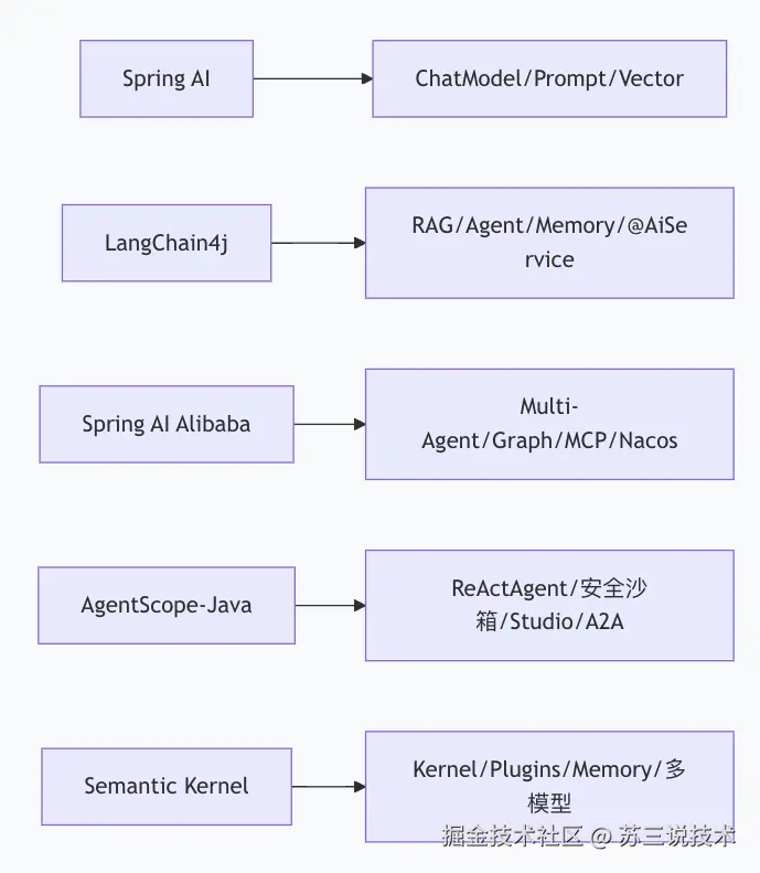 | 维度 | Spring AI | LangChain4j | Spring AI Alibaba | AgentScope-Java | Semantic Kernel |