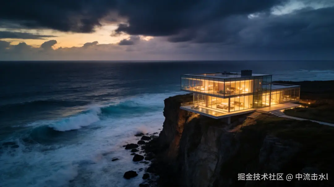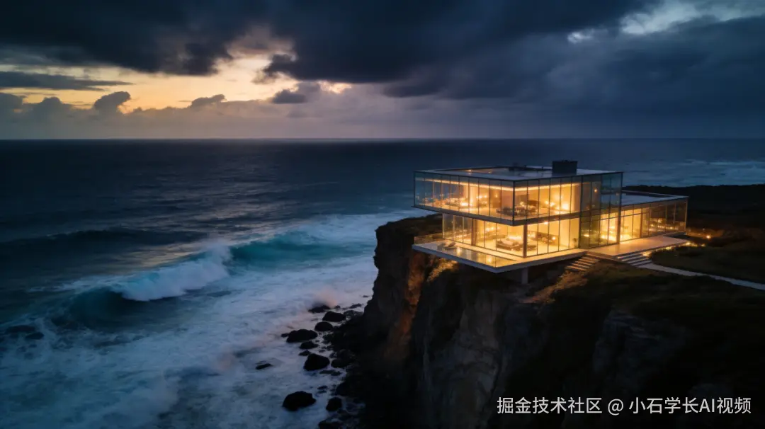 像这种悬崖别墅的宏大定场镜头,纯文本直出就很适合拿来做一场戏的开场。