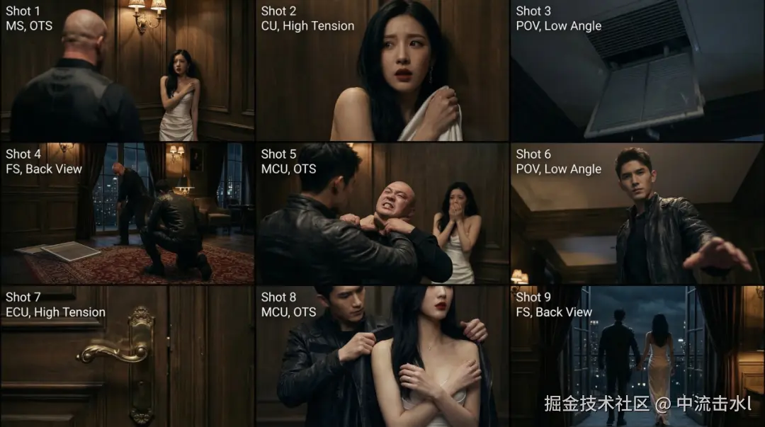 做法也很直接:先把角色和场景资产准备好,再让模型按剧情一次生成九宫格或者连续 shots,然后从里面挑最合适的画面放大精修。