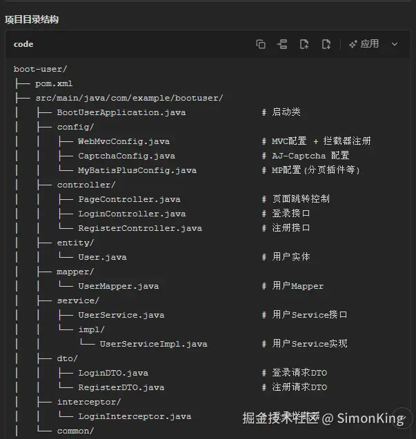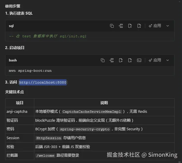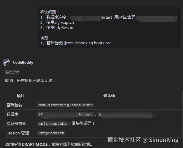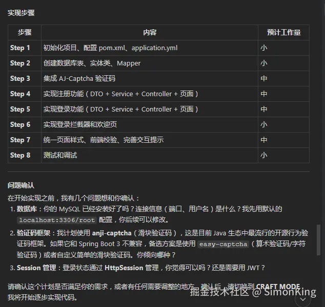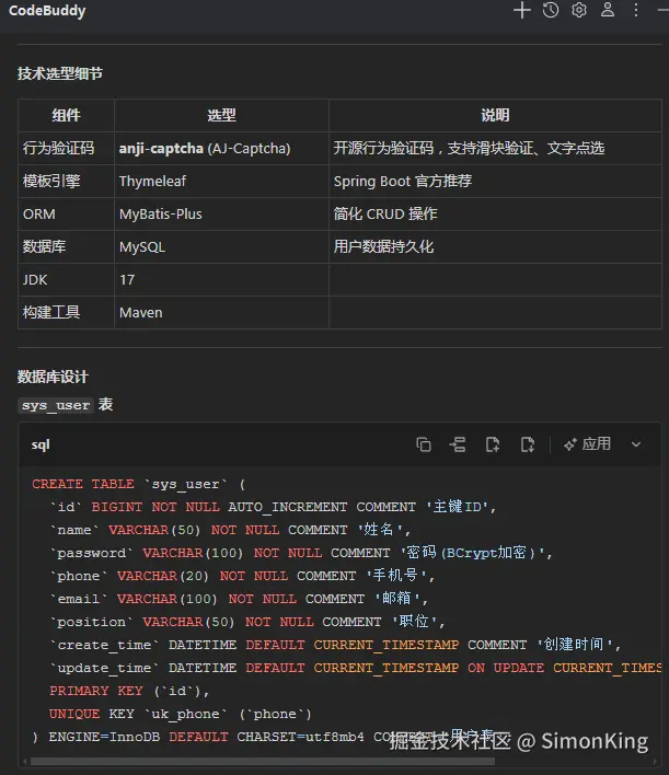 需求提示词中提到了行为验证码,AI帮我们选择了anji-captch开源框架,以及做了数据库的设计。