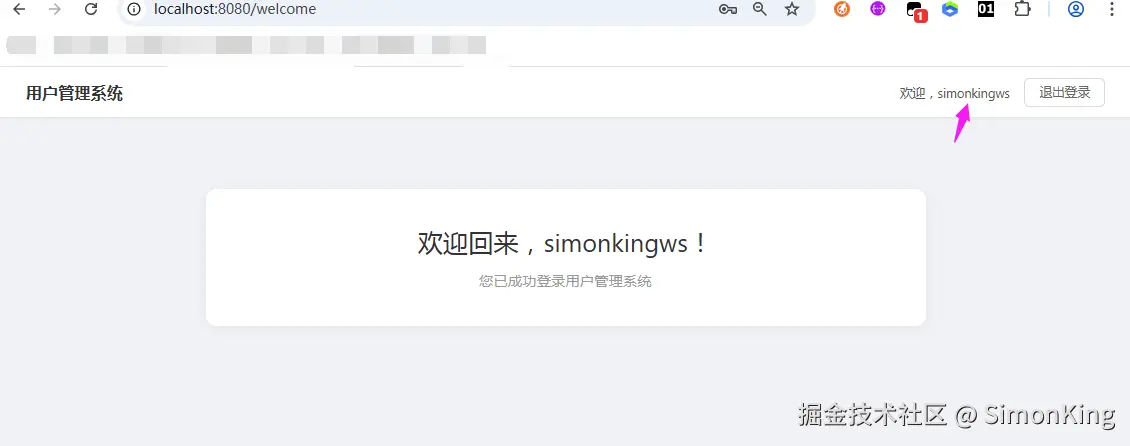 3、登录完成之后跳转到欢迎页,欢迎页右上角显示登录用户的姓名