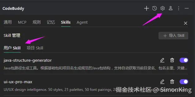 Skills的设置是在.codebuddy/skills/目录下,直接将需要的skills复制过去即可,也可以通过页面的导入功能完成。