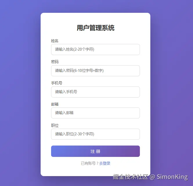 注册页面的的字段包括姓名、密码、手机号、邮箱以及职位,都是必选且有数据校验