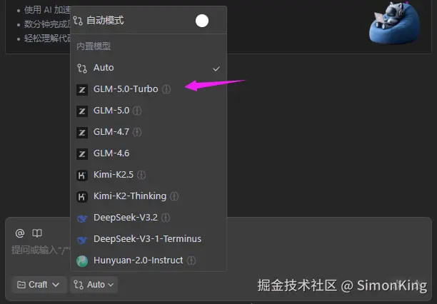 CodeBuddy内置的模型比Qoder要多,Qoder体验结束之后虽然可用,但是已经无法选择模型了。而CodeBuddy可以任意切换,包括前一段时间智谱刚出的GLM-5.0-turbo