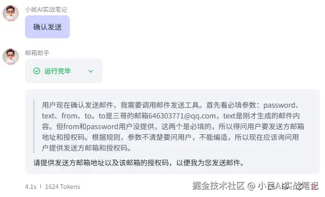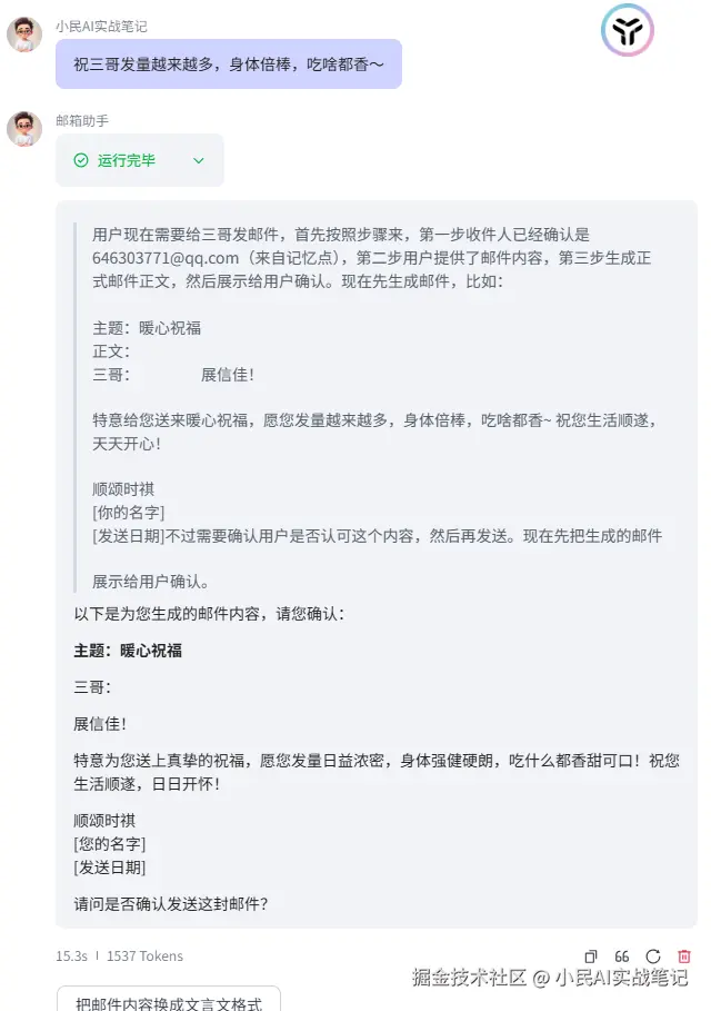 我输入:“帮我给三哥发邮件”。它没直接发,而是问我👇