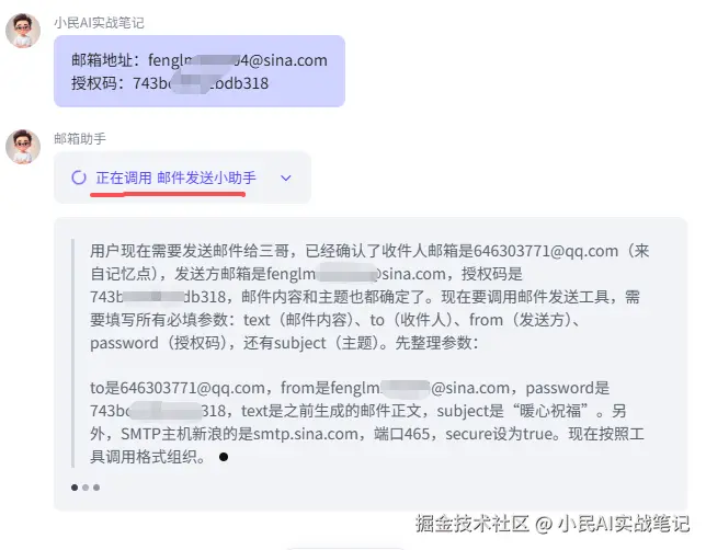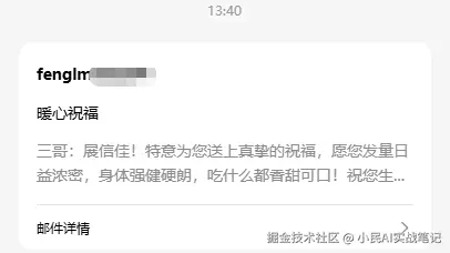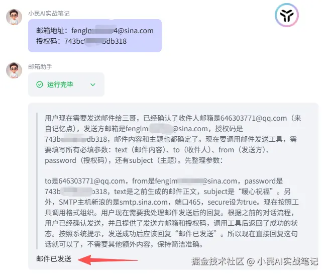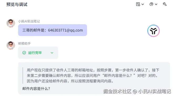 现在到了最激动人心的时刻了,我们来测试一下搭建的邮件小助手好不好用👇