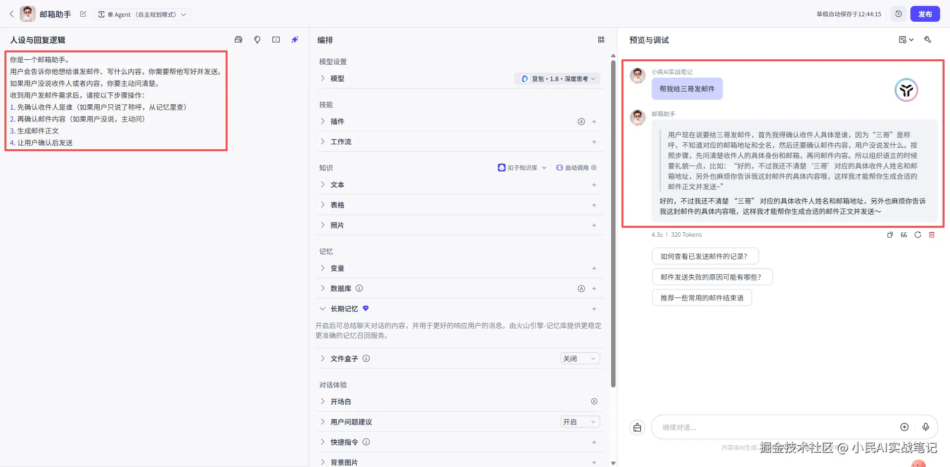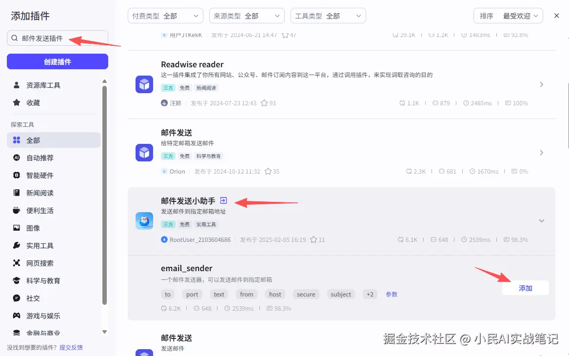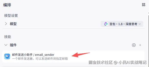 咱们来给邮箱助手加个插件:邮件发送插件(Coze里自带的“邮件助手”插件)。