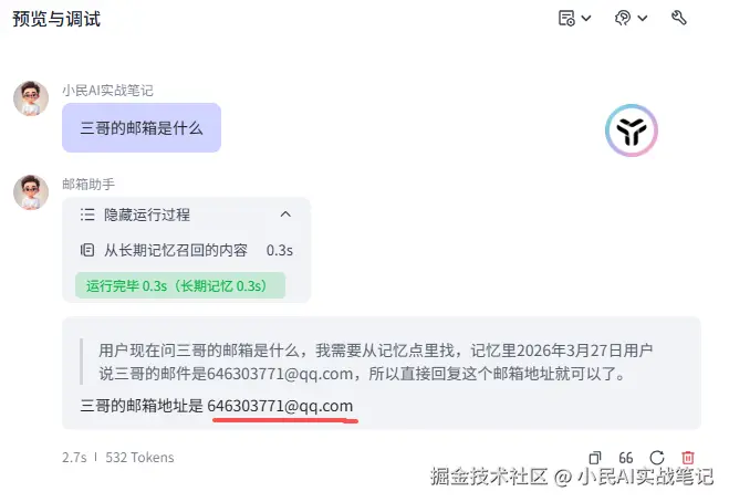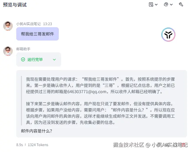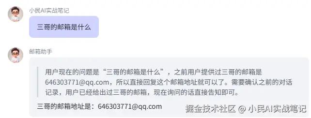 配置完成后,我告诉它“三哥的邮箱是:646303771@qq.com”,虽然我写成了“邮件”,但它懂了🤣