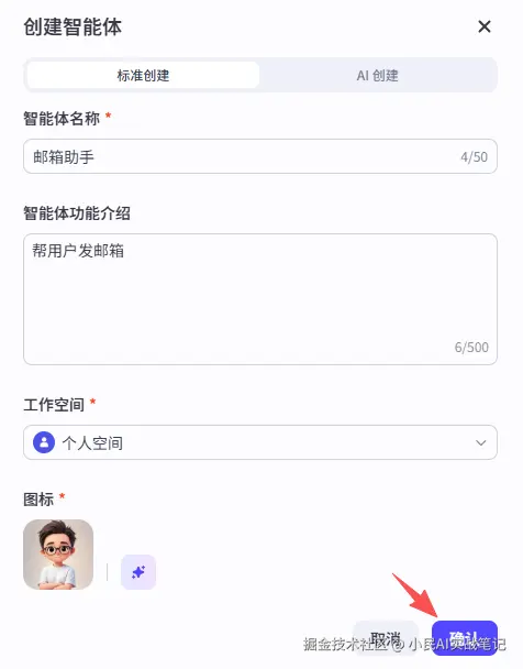 ② 填写好智能体名称、功能介绍和图标