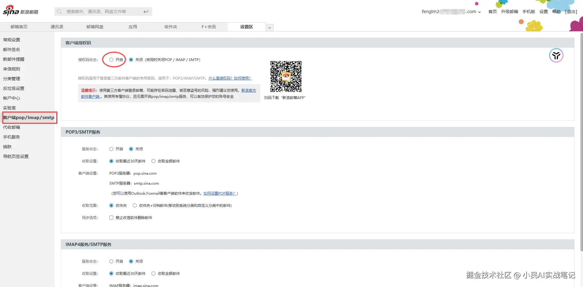 登录新浪邮箱网页版,进入「设置」→「客户端pop/imap/smtp」
