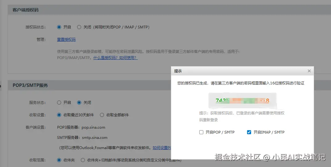 📌小提示: 授权码和邮箱登录密码不同,是专门给第三方客户端使用的。记得保存好,它只会完整显示一次。