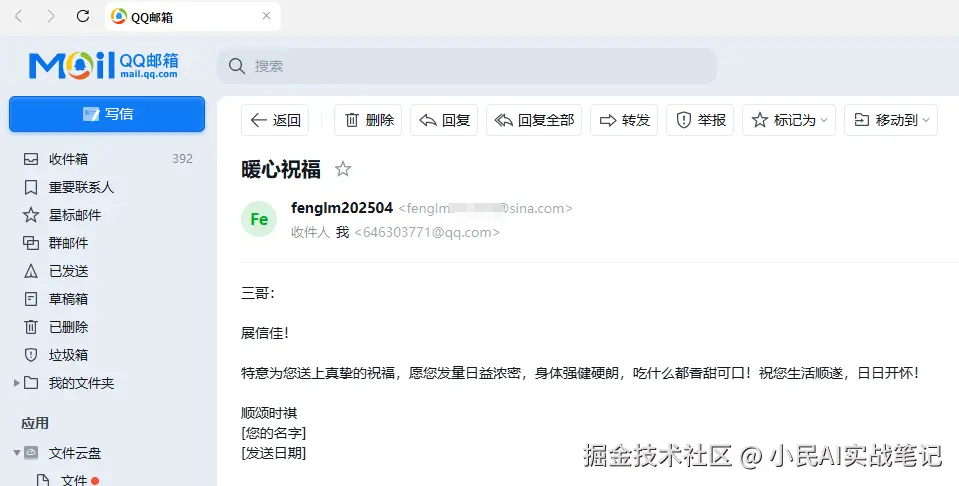 如上图,成功收到了小助手发送的邮件,虽然有一点小瑕疵(没有自动填充我的名字和发送日期),但核心流程完全跑通了。