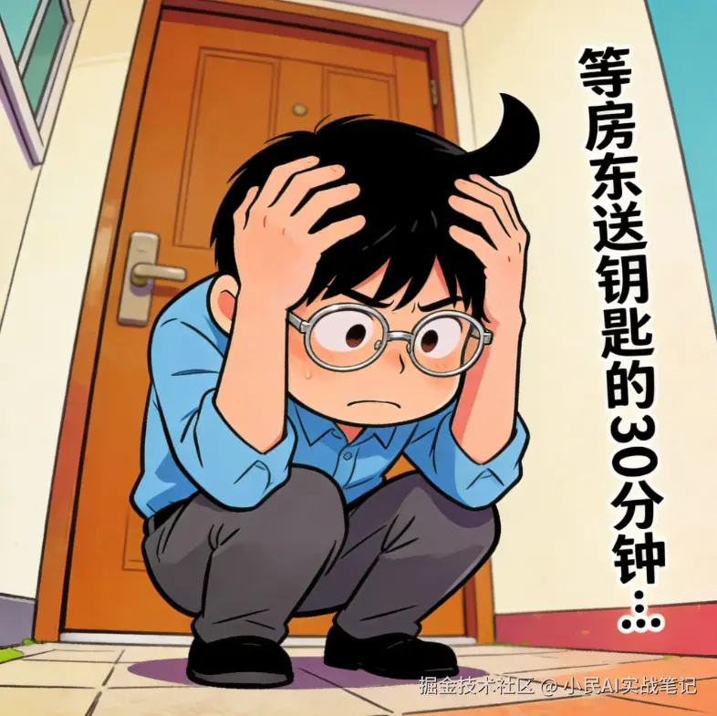 第3格:阿瓜蹲在门口抱着头,一脸生无可恋,旁边配字“等房东送钥匙的30分钟...”