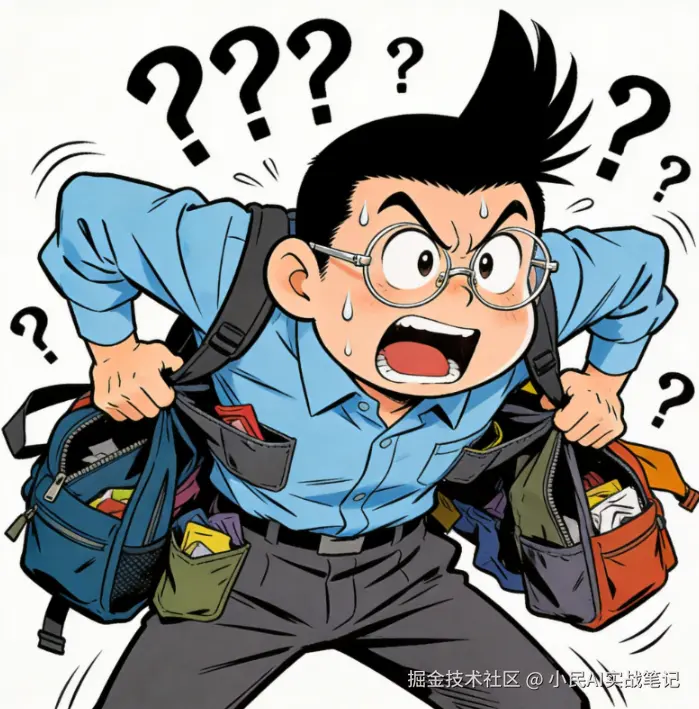第2格:阿瓜翻遍所有口袋和背包,表情崩溃、张大嘴,周围飘着“???”