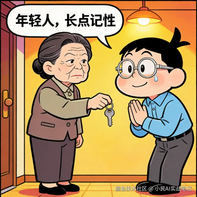 第4格:房东阿姨出现,拿着钥匙,阿瓜双手合十感动得快哭了。房东对话气泡:“年轻人,长点记性”