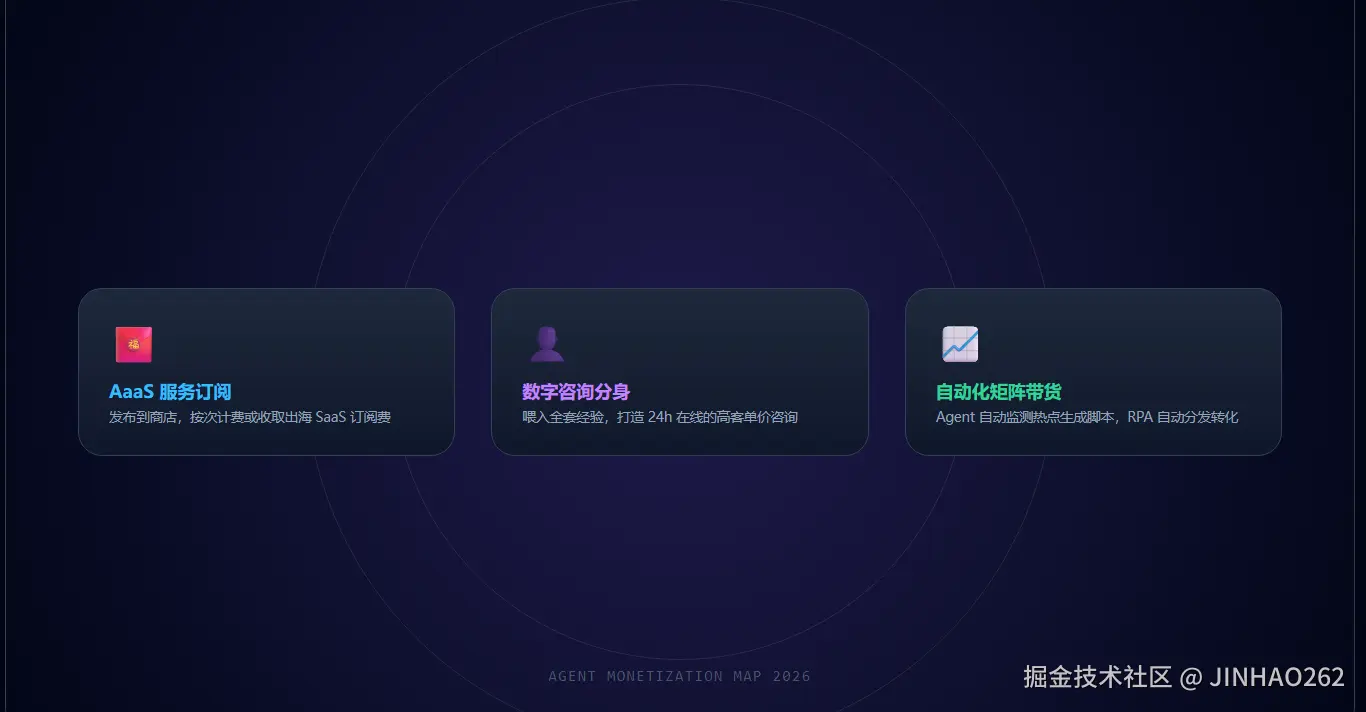 只把Agent当作自我提效的自用工具,是对2026年AI红利的巨大浪费。高阶玩家正在通过以下三种模式实现商业变现的大航海: