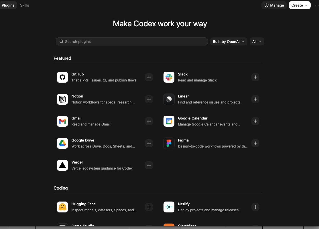 codex的左上角多了一个plugin的入口,点击进去就是插件市场。