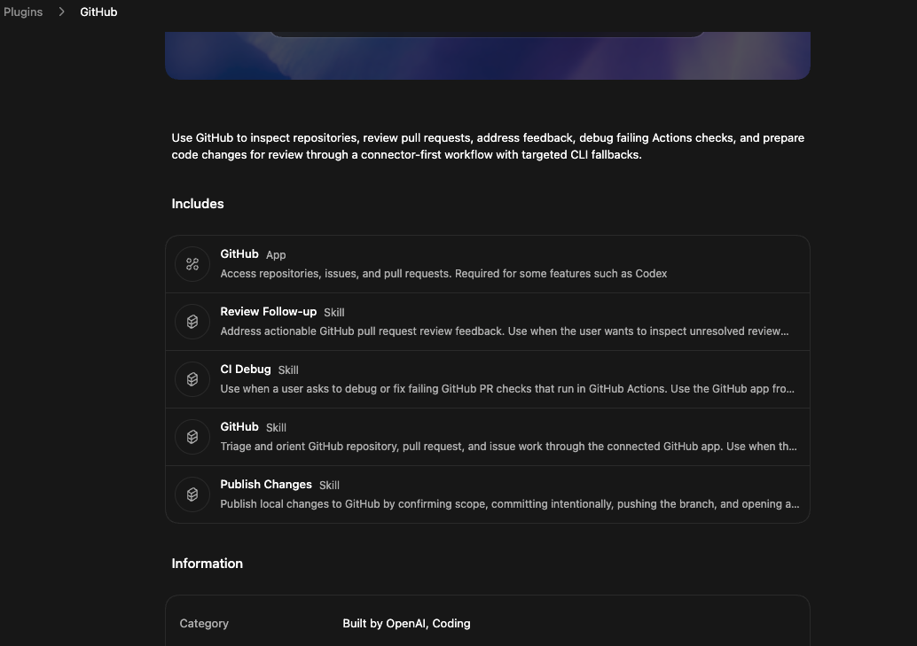 以前这些能力就算都能自己配出来,很多时候也是分散的。GitHub 连接是一块,处理 review feedback 的 skill 是一块,排查 CI 的 skill 又是一块,提交和发布流程可能还是另一套。