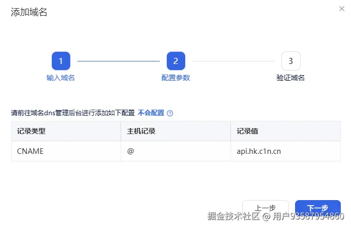第三步:进入以下页面,先不要点击【下一步】,我们需要先去配置域名的dns解析记录。如果不清楚如何添加,可以联系自己公司负责域名管理的同事。
