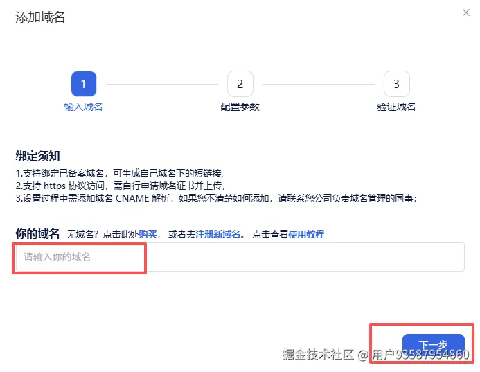 第二步:输入你的品牌域名,点击【下一步】