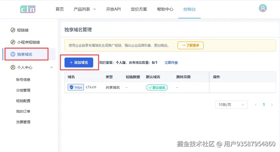 第一步:登录C1N短链接官网(c1n.cn),进入控制台,找到【独享域名】,点击【添加域名】。