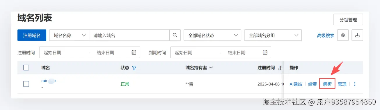 1.进入域名提供商管理后台,找到域名列表,点击【解析】进入域名配置信息页面。(这里以阿里云为例,其他平台的步骤也基本相似,可以作为参考)