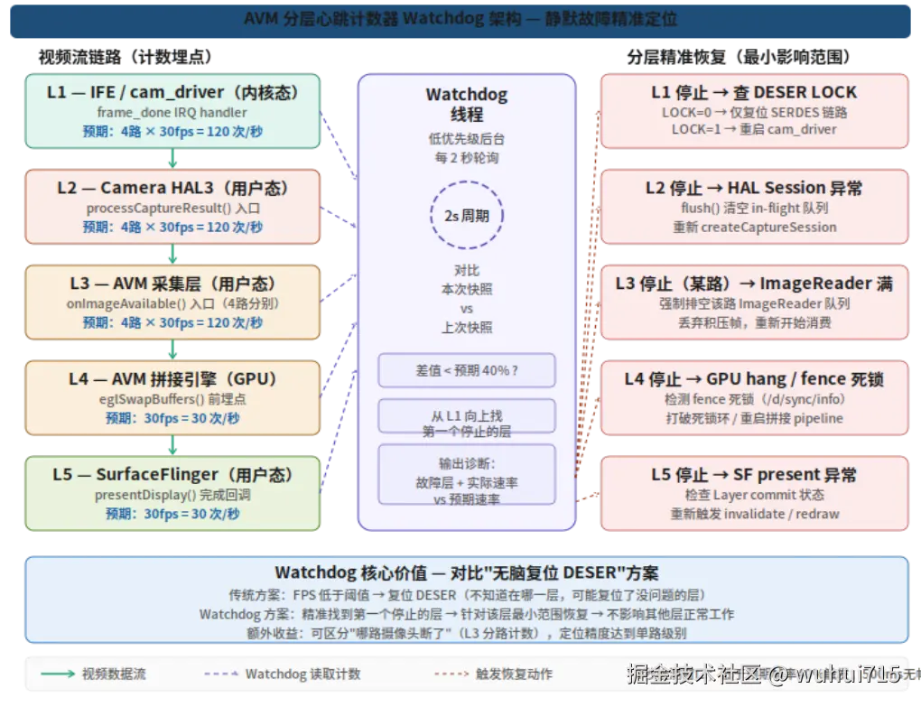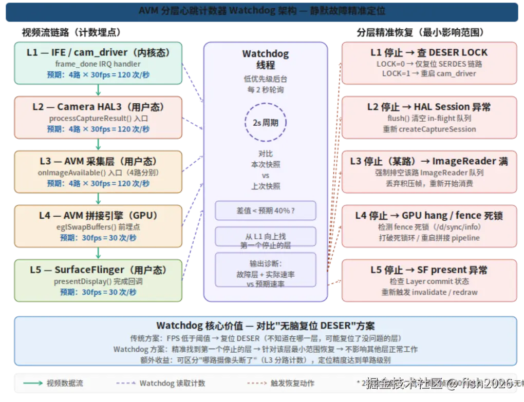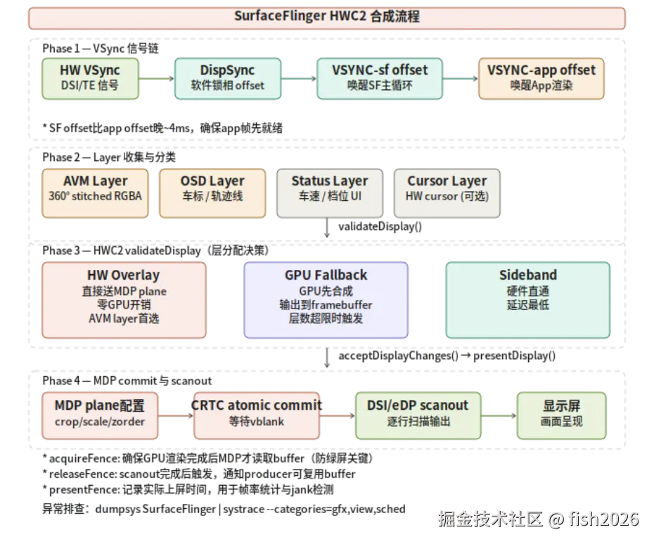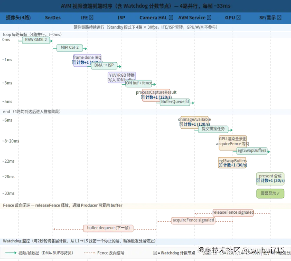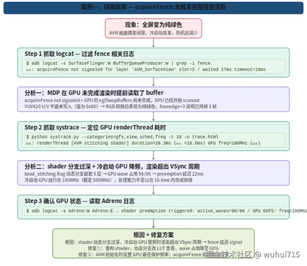 | 修复③ | acquireFence 等待超时(>16ms)时记录告警,向诊断服务上报故障码 |