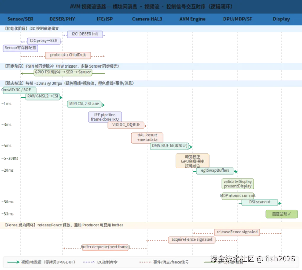 零拷贝设计原则:Sensor→IFE→IPE→AVM Engine→DPU 全链路通过 ION 分配的 DMA-BUF fd 共享 buffer,CPU 全程不参与内存拷贝。控制命令与视频数据流完全解耦,是避免内存带宽瓶颈和降低延迟的关键设计。