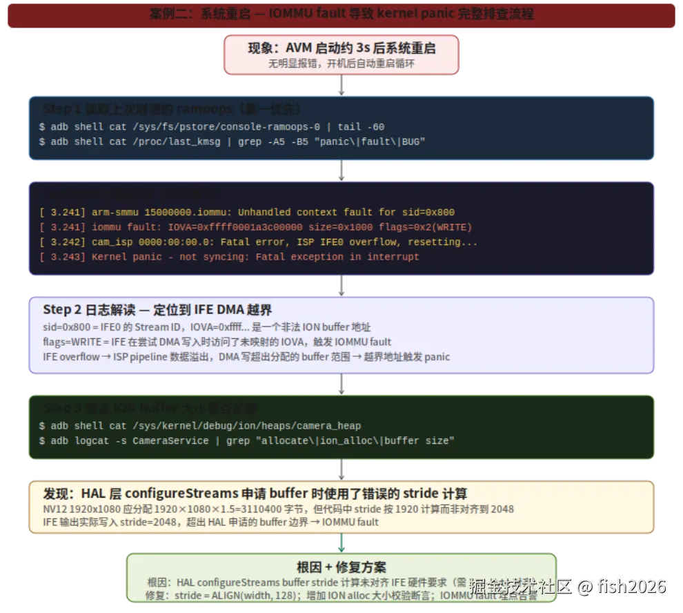 常见陷阱:HAL 按 stride=width 计算 buffer 大小,IFE 实际按 stride=2048(128B对齐)写入,导致越界 207KB → IOMMU fault → Kernel panic。务必以 IFE 上报的 stride 为准。