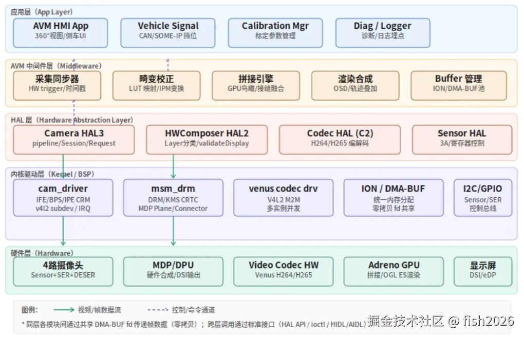 AVM 软件栈按五层组织,视频帧数据通过 DMA-BUF fd 在各层间零拷贝传递;控制命令走独立的 Binder IPC / ioctl 通道。