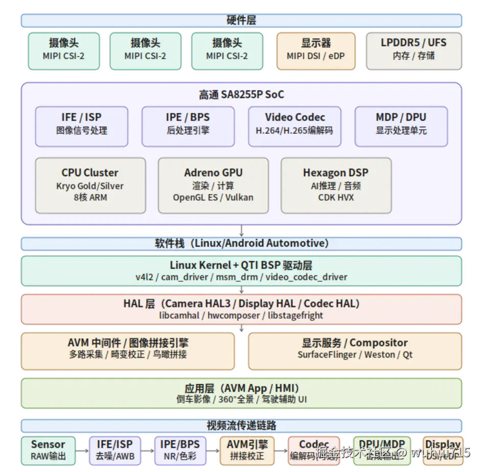 SA8255P 是高通面向汽车智能座舱设计的 SoC,集成 Kryo CPU、Adreno GPU、Hexagon DSP、多路 MIPI CSI-2 输入和 MIPI DSI/eDP 输出,支持 4 路乃至更多路摄像头同时接入,满足 AVM 对多路低延迟视频采集与实时鸟瞰拼接的需求。