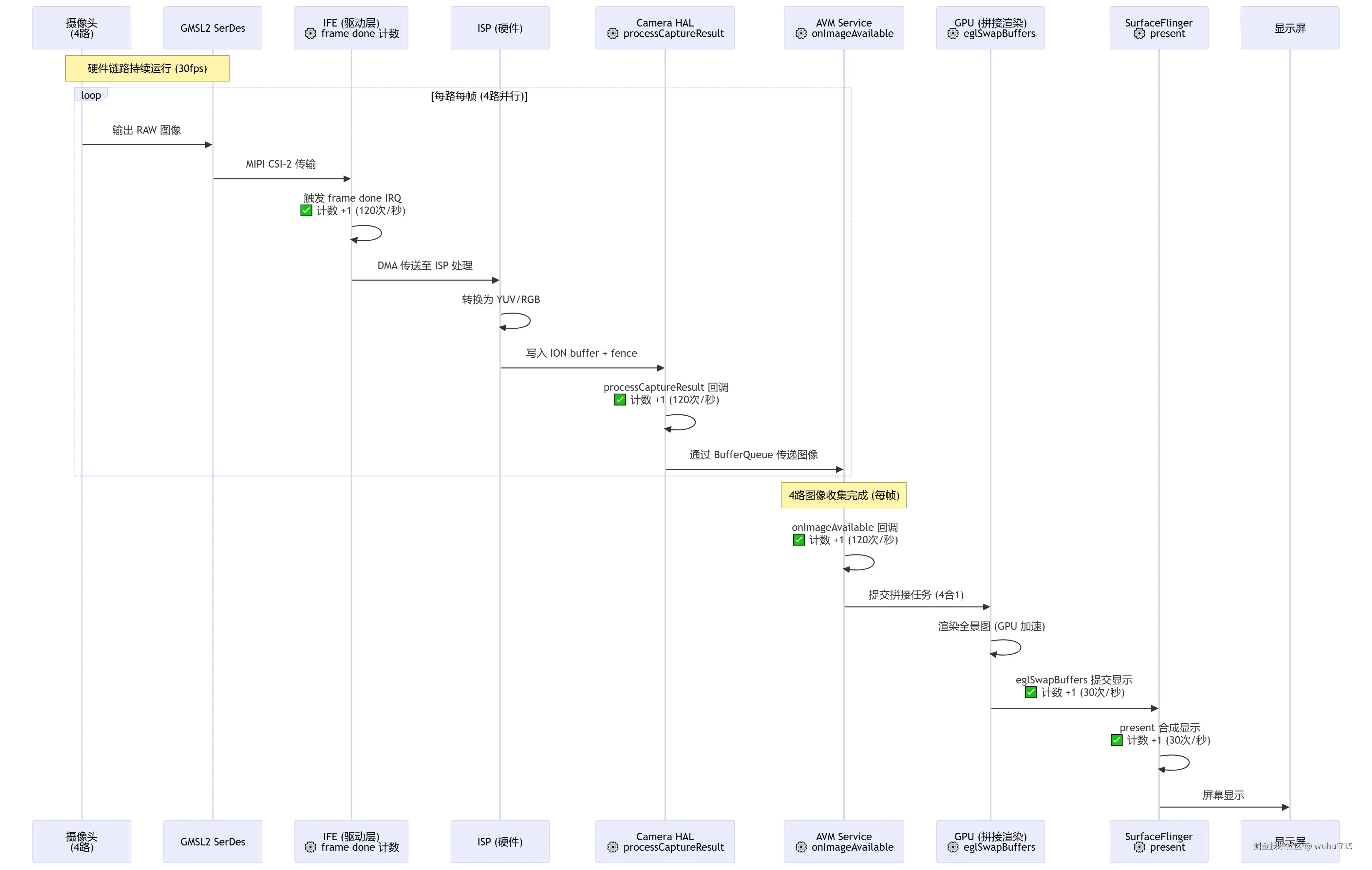 | AVM eglSwapBuffers | GPU 渲染完成 | 1路 × 30 = 30次/秒 |