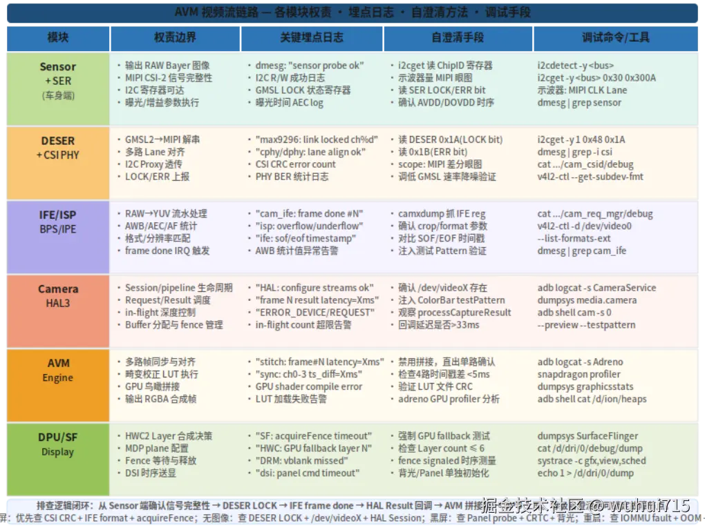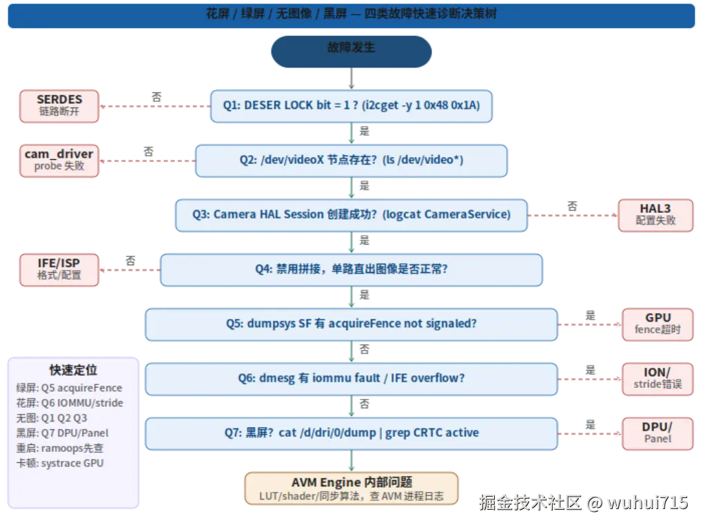 本手册描述基于高通 SA8255P SoC 的车载 AVM(Around View Monitor,全景影像系统)完整软硬件架构、视频流传递链路、各软件层交互时序,以及绿屏、花屏、无图像、黑屏、系统重启等典型问题的系统化排查方法,并附有基于真实 dmesg / logcat / systrace 日志的完整故障分析案例。