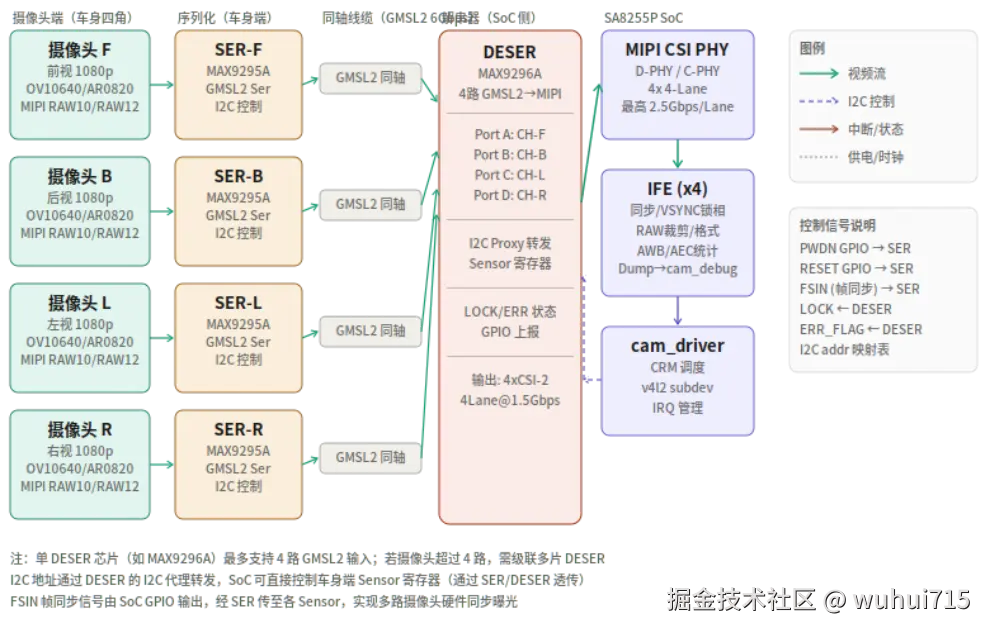 | Deserializer | MAX9296A | 4 路 GMSL2→MIPI,LOCK/ERR 监控 | LOCK/ERR_FLAG GPIO,I2C Proxy |