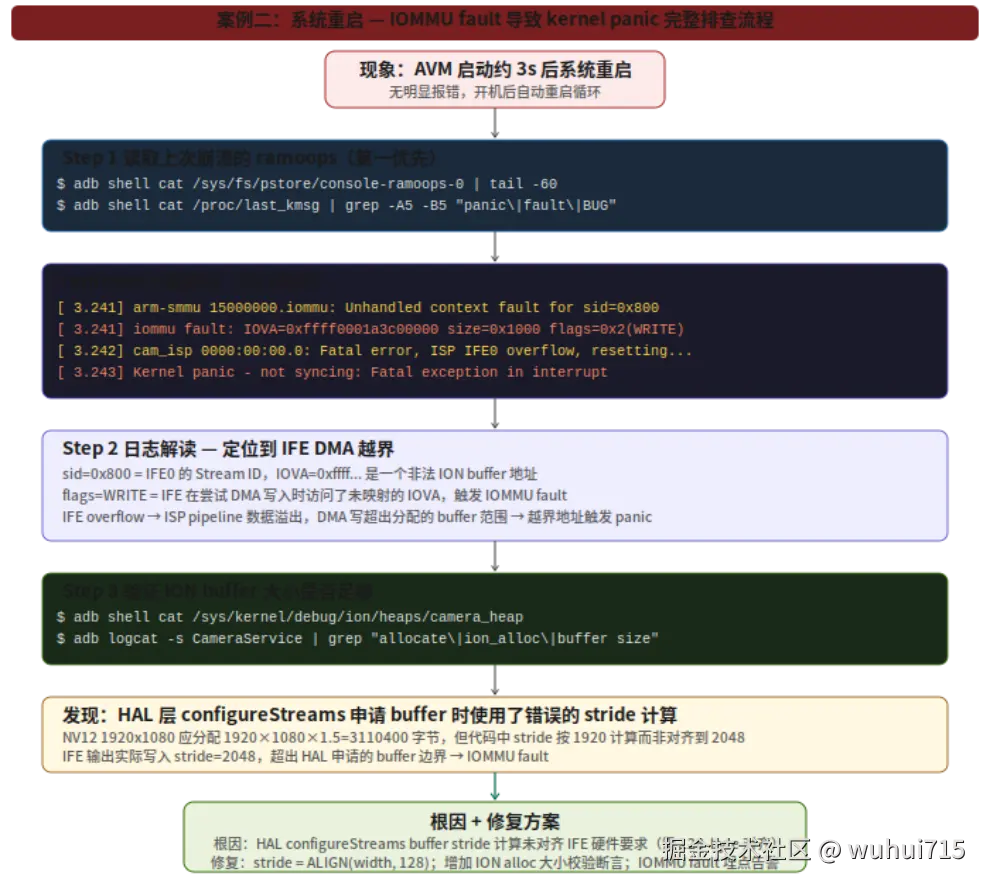 | 根因 | HAL configureStreams 用 stride=width=1920 计算 NV12 buffer 大小,IFE 实际输出 stride=2048(128B对齐),越界 207KB,触发 IOMMU fault |