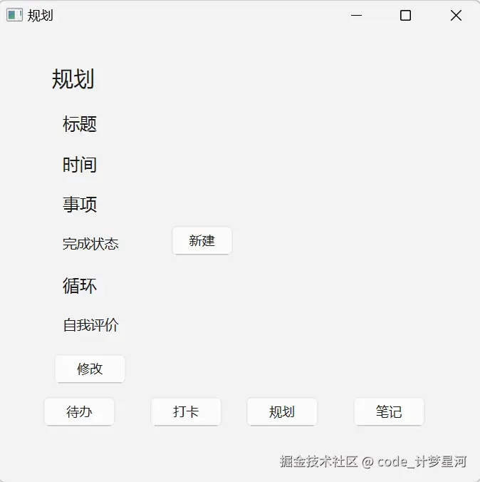笔者是一个大一下计科生,本学期的课程设计自命题完成一个督促学生自律的打卡软件,目前已经完成了待办和打卡部分功能,本篇要完成规划板块不需要存储就能实现的功能