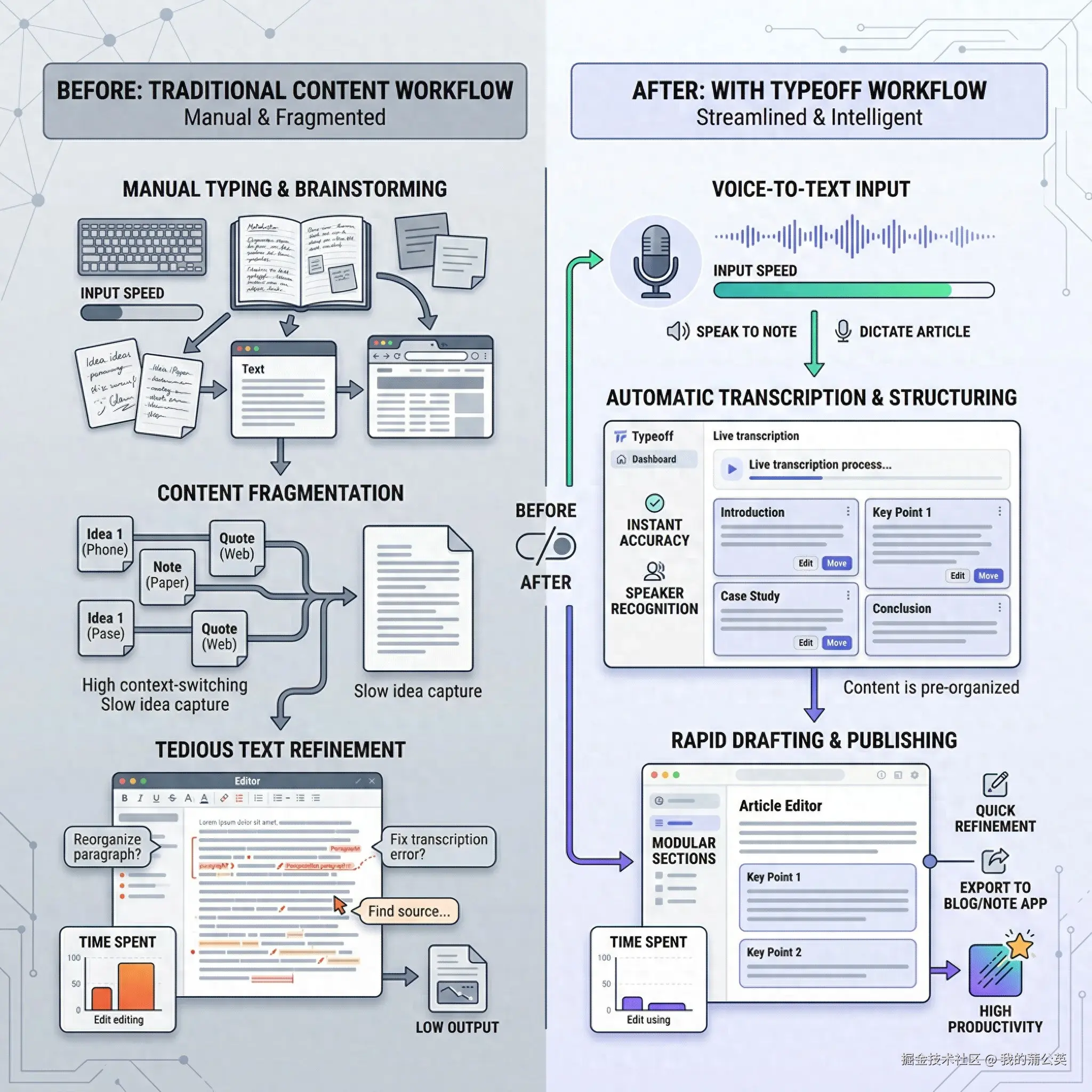 - 旧流程: 对着屏幕苦思冥想,挤牙膏式打字。
