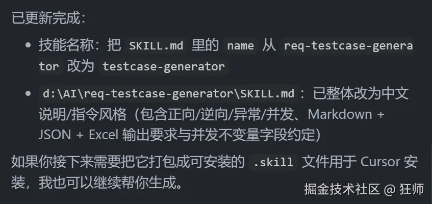 执行完成后,Cursor问我们是否需要将技能名称修改一下,另外,由于当前Skills.md内容默认显示英文,爱国且宠粉的我,怎能允许全是英文,如是让AI直接将内容改为中文输出。