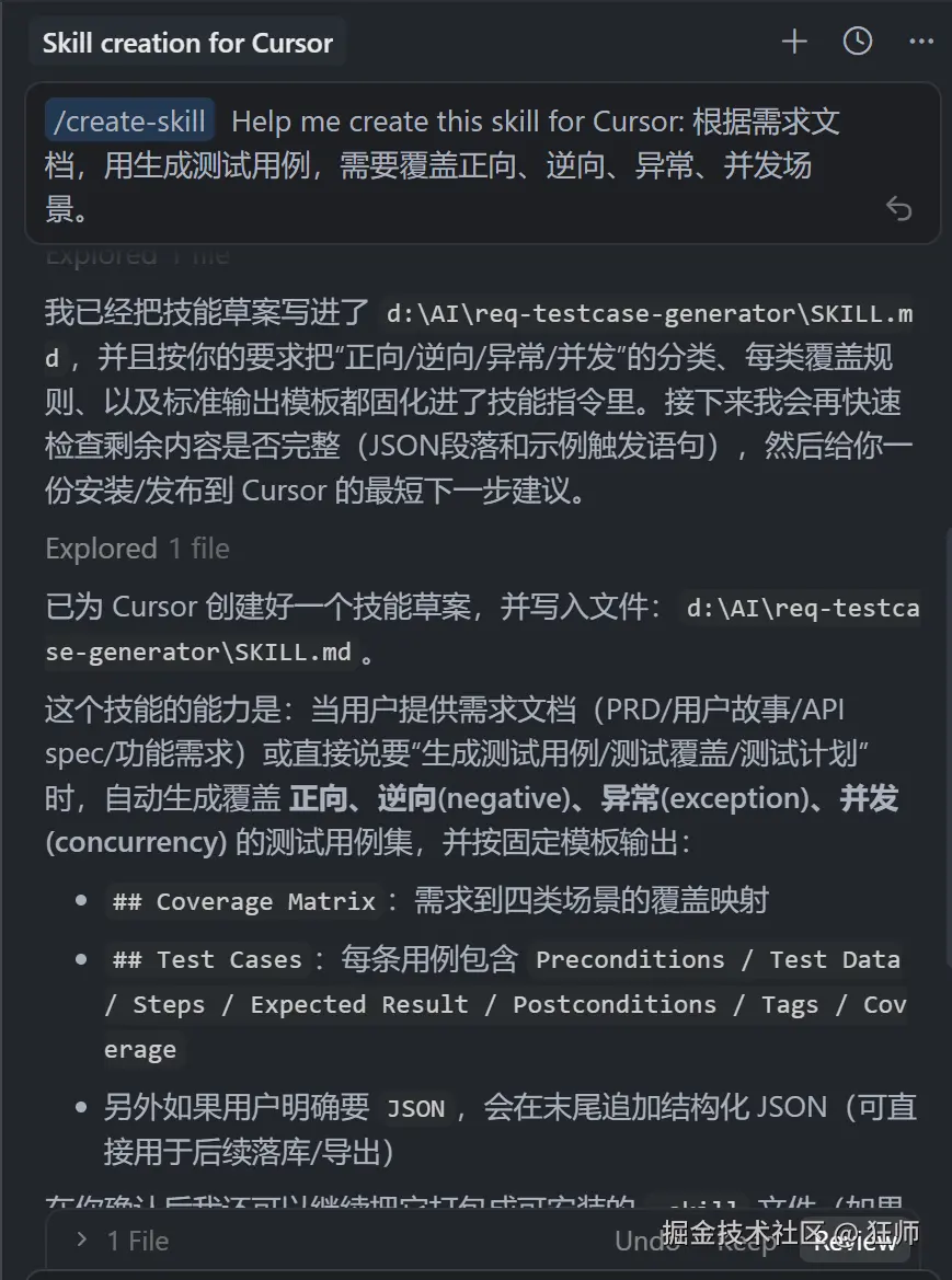 将上述创建skills提示词发送给Cursor,AI会先帮我们创建一个技能草稿,并将内容写到SKILL.md中
