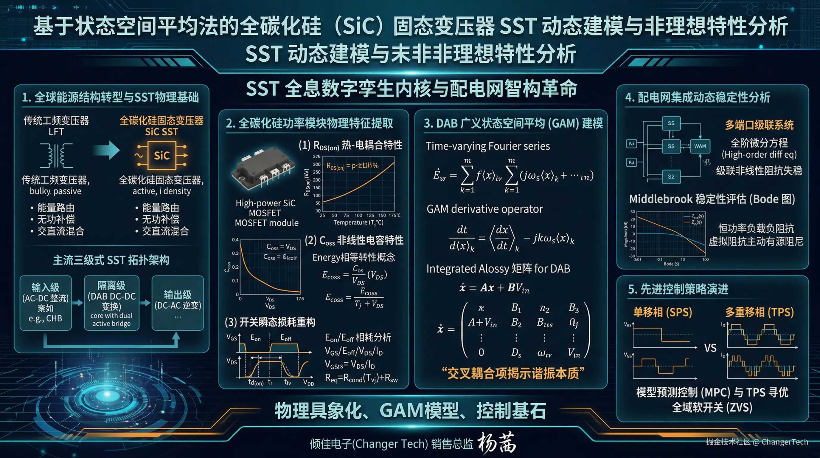 在全球能源基础设施面临深度智构革命的关键节点,全碳化硅固态变压器(SST)作为交直流混合微电网的核心能量中枢,展现出极其广阔的工业与学术前景。本研究跳出传统电力电子理想建模的固有范式,采用由下及上、物理到数学深度耦合的广义状态空间平均法(GAM),构建了一套真正具备多物理场高保真度的固变SST核心级数字孪生模型。