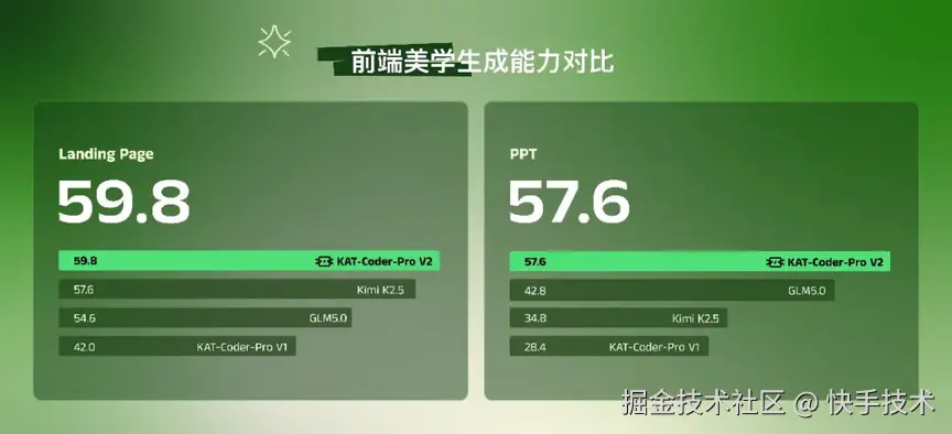与此同时,KAT-Coder-Pro V2 在前端美学生成方向取得突破性进展——在 Landing Page 和 PPT 场景中,用户仅需口语化描述,即可获得接近结构化设计 spec 输入水平的高品质输出。这意味着模型的服务边界从过去仅 1% 量级的专业用户,真正扩展到亿级普通用户。