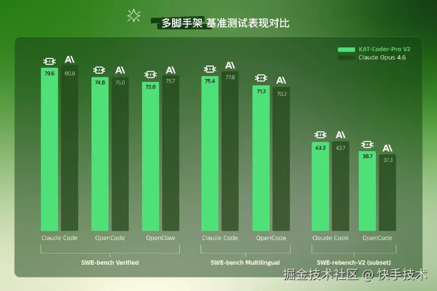 值得一提的是,KAT-Coder-Pro V2 的脚手架泛化能力并不局限于 OpenClaw 单一框架。我们同步在 Claude Code、OpenCode 等主流脚手架上进行了评测,结果表明模型在跨框架场景下同样具备出色的适配能力。