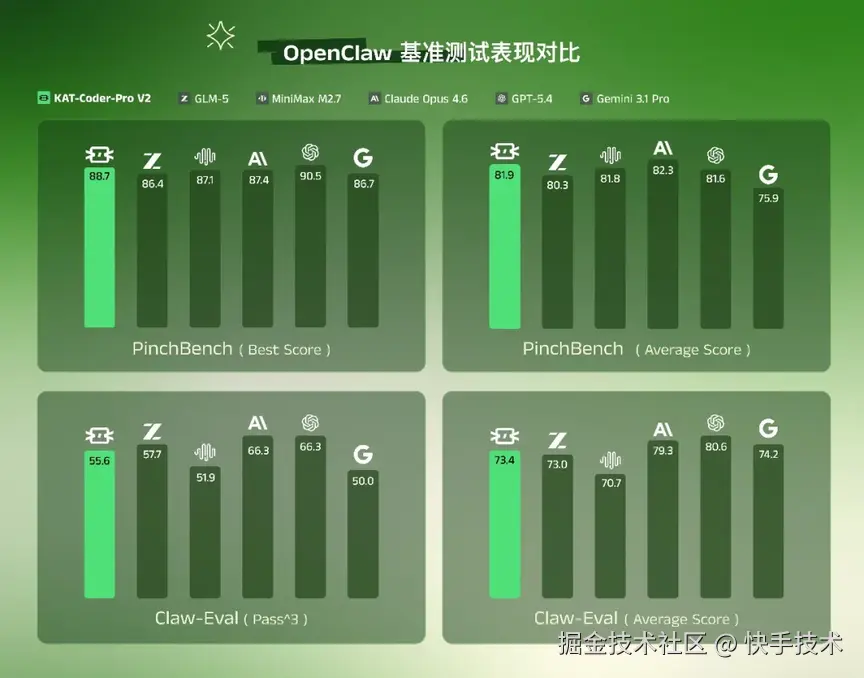 KAT-Coder-Pro V2 是 KwaiKAT 最新打造的旗舰级 Agentic Coding 模型。在 Agentic 场景下,KAT-Coder-Pro V2 具备强大的脚手架泛化能力,兼容 10 多种主流的 AI 编码工具,例如 Claude Code、Cline、Kilo、OpenCode,提供更大的灵活性。并针对 OpenClaw 进行了专项训练与深度优化,能够从容应对真实世界中的复杂应用流程。